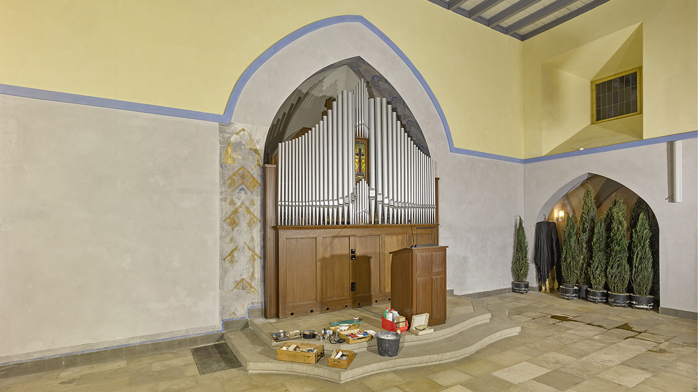 Restaurator Andreas Brückner weist auf ein kleines Stück blauer Farbe am Rand der Decke hin: „Das war die Originalfarbe der Balken.“ Sie erhielten dann aber doch einen dezenteren grauen Farbton. „Auch die Muster an den Unterzügen hatten ursprünglich kräftigere Farbtöne,“ ergänzt er. Das Blau an der Decke korrespondierte mit der blau gefassten horizontalen Teilung des Raums. Allerdings war auch dieses Blau einmal kräftiger. Ein kräftiger Blauton in Richtung eines Kobalttons findet sich an einer großen freigelegten Stelle links der Orgel. Hier sieht man einen gemalten Pfeiler, der mit einem Muster mit auf der Spitze stehenden Quadraten versehen ist. Fast erinnert es an ein Fliesenmuster mit blauen Fugen. Farblich kontrastieren hier stark Ocker- und Blautöne. Man kann Blüten erahnen, die mit elegantem Schwung gemalt sind. Das Muster endet oben in einem Spitzbogen, der mit Goldfarbe betont ist. An der rechten Seite konnten keine Farbreste gefunden werden. „Da es sich aber um eine symmetrische Gestaltung gehandelt haben dürfte, könnte man das Muster auf der rechten Seite ergänzen,“ meint Andreas Brückner.