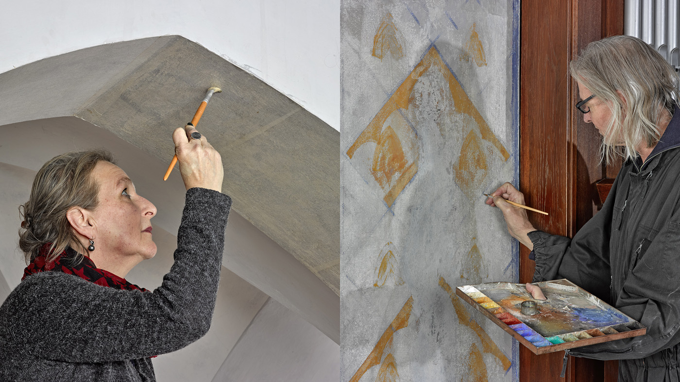Die freigelegten Malereien im großen Spitzbogen und links der Orgel bleiben sichtbar. Die kleinen Sondagefenster an den Wänden und in den Gewölben werden ebenso wie jene an den Arkaden zu den Seitenschiffen im Laufe dieser Woche wieder geschlossen. Restauratorin Katja Welbers klebt vorsichtig Japanpapier als Trennschicht und Grundlage für die Spachtelmasse auf, damit bei Bedarf die Sondagefenster wieder geöffnet werden können.