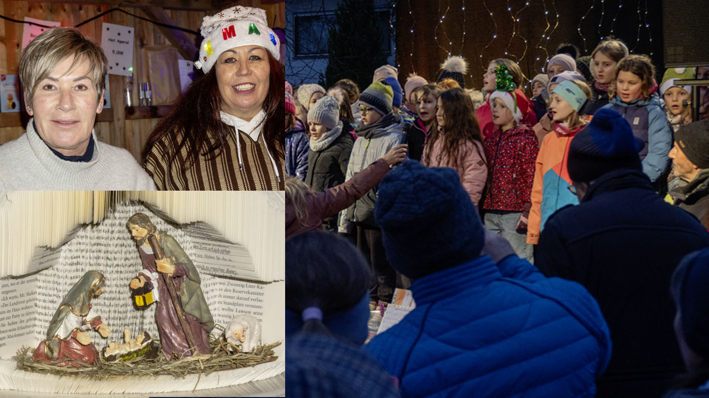 Im CJE-Saal geht es ruhiger zu. Dort gibt es kunsthandwerkliche Dinge und die Besucher stöbern zwischen den kleinen Sachen, die als Geschenke geeignet sind. Heike und Daniel haben kleine Häuschen mit Beleuchtung gebastelt. Für die Kinder formt Luftballontwister Friedrich Luftballons zu Tieren und am Schminkstand verwandelt sich so manches Mädchen in einen Fuchs oder ein anderes Tier. Waltraud Fritz aus Unterweissach bietet eigene Strickwaren wie Socken, Schals oder Topfuntersetzer an. Für die Leckermäulchen ist Petra Pfeiffer aus Steinbach die richtige Anlaufstelle, die neben Marmelade ein ganzes Sortiment von Pralinen, Weihnachtsgebäck und Früchtebrot aufgefahren hat – natürlich alles selbstgemacht. Für viel Beachtung sorgt Buchfaltkunst von Ute Grozynski aus Sachsenweiler. Sie verwandelt alte Bücher in kleine Kunstwerke, indem sie raffiniert die Seiten umfaltet und dann so einschneidet, dass Bilder entstehen. Passend zur Weihnachtszeit hat sie aus einem Buch eine Krippe gemacht.