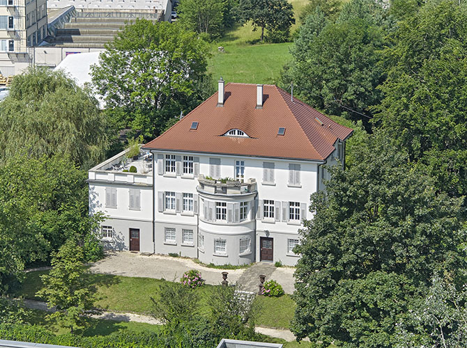 Das dreigeschossige Gebäude der Familie Räuchle thront auf einer kleinen Erhöhung – freistehend mitten im grünen Park. Es erinnert an die Zeit des Klassizismus, die in der Ästhetik viel Wert auf Symmetrie und geometrische Grundformen gelegt hat. Der quadratische, klare Grundriss wird im Zentrum durch einen zweigeschossigen halbrunden Erker mit einem Balkon aufgebrochen. An der Nordwestfassade schließt sich ein 1949 – 50 errichteter Anbau mit Dachterrasse an. Die Villa aus der Zeit des großbürgerlichen Stils gehört sicher zu den architektonischen Höhepunkten der Stadt und befindet sich heute noch im Eigentum der Familie Räuchle.