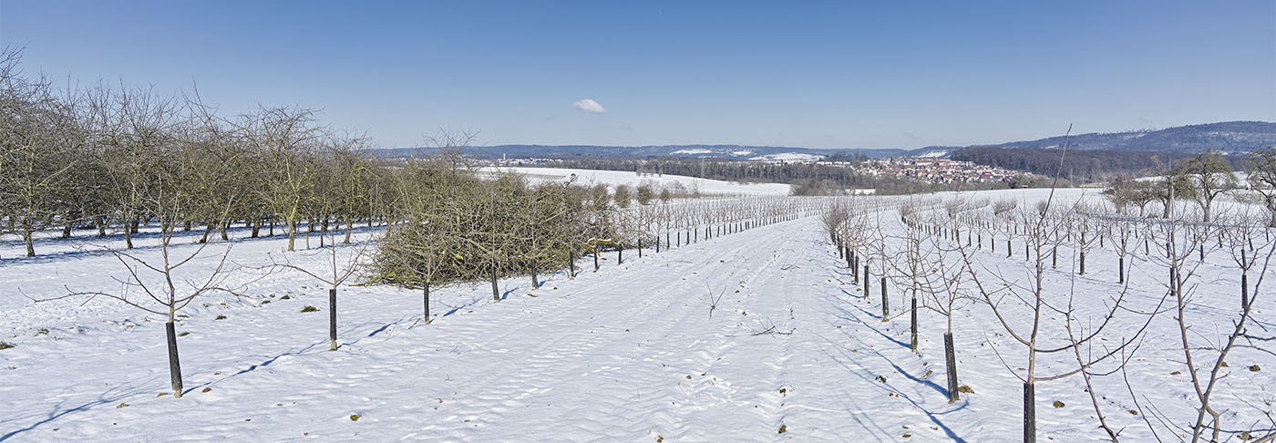 Wie mit ganz feinem Stift gezeichnet stehen die jungen Obstbäume im Schnee. Da kann man schon ein bisschen Mitleid mit den Kleinen kriegen. Gegen Wildverbiss von Rehen aus dem nicht allzu fernen Herrenhölzle sind sie geschützt – aber dass der Fraßschutz um die dünnen Stämmchen auch vor Kälte schützt, das darf man bezweifeln.