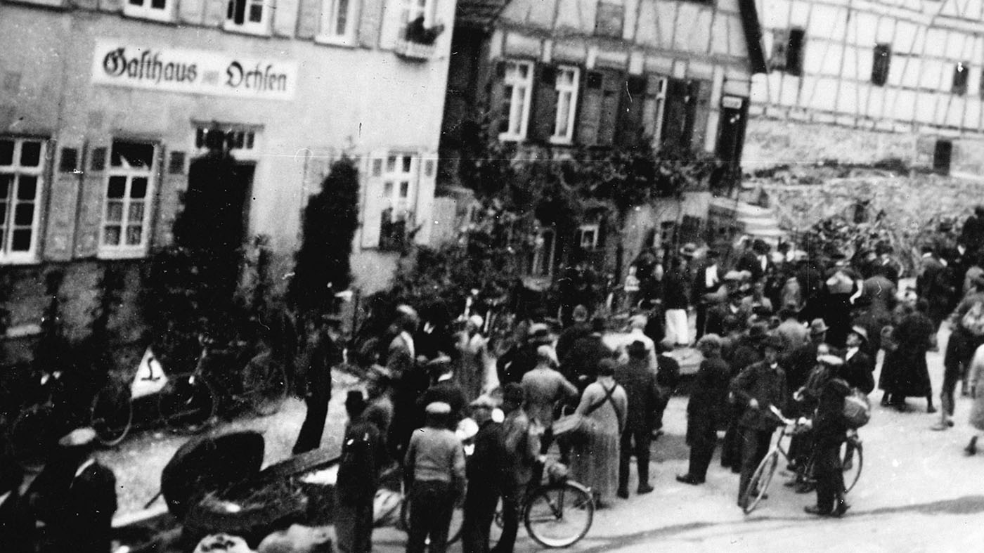 Vor dem „Ochsen“ zahlreiche Fahrräder und Menschenmenge | © Stadtarchiv Backnang