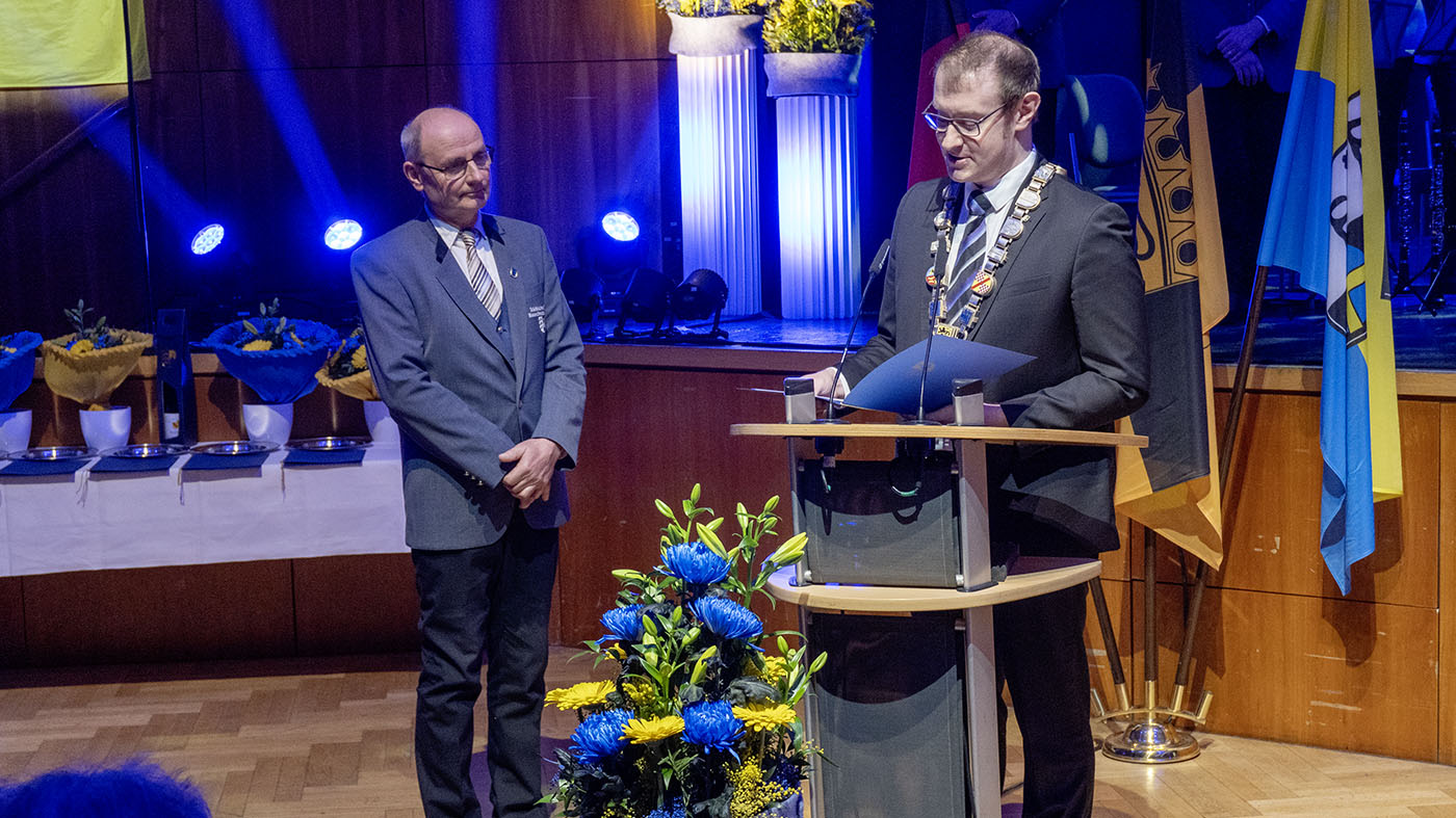 Seit 1982 spielt Albert Lang mit den Turmbläsern auf dem Backnanger Stadtturm Ehrungen für verdiente Bürger beim 60. Neujahrsempfang im Backnanger Bürgerhaus Der Neujahrsempfang der Stadt Backnang ist auch immer ein Anlass für Ehrungen von Persönlichkeiten, die sich um die Allgemeinheit und das Wohl Backnangs verdient gemacht haben. Am 9. Januar 2026 standen sieben Ehrungen auf dem Programm. Albert Lang erhielt die Backnanger Kanne, der Ehrenteller der Stadt Backnang ging an Dr. Annedore Bauer-Lachenmaier, Ingrid Beerkircher, Umberto Guancialino, Pia Täpsi-Kleinpeterund Helga Wilke. Oberbürgermeister Maximilian Friedrich überreichte die Ehrungen, die im Backnanger Ehrungssystem die dritt- und vierthöchste Stufe darstellen, unter dem Beifall des Publikums.